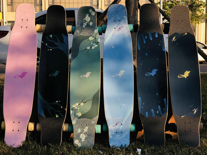 滑板主要是由板面、桥(支架)、轮子、轴承、砂纸等组成。而板面是滑板辨识度最高的部分,不同的板面材质和图案带给人不同的感官体验。现在的很多的玩具滑板,主要也是靠“颜值”获得了不错的市场销量,甚至超过专业滑板。那也是为什么滑板厂商越来越重视板面图案的设计和制作,也让UV平板打印机这种换图灵活、无需制版、即打即干的工具应用到产品制作过程中。