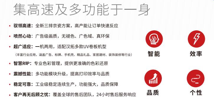 追求技术的卓越、做工的精细、客户的满意度,是京瓷60年一直向社会作出的承诺。作为京瓷全球重要合作伙伴,汉弘集团与之真诚合作十余载,自主开发喷头驱动技术,积累了十多年的高速工业喷头研究和使用经验。现在汉弘集团旗下的各产品线都配备了京瓷喷头,青青草视频免费看数码UV打印机将京瓷喷头的应用提高到了一个新的高度,并且通过工艺、方案的不断升级,使这类喷头在速度和稳定性方面有了质的提高。